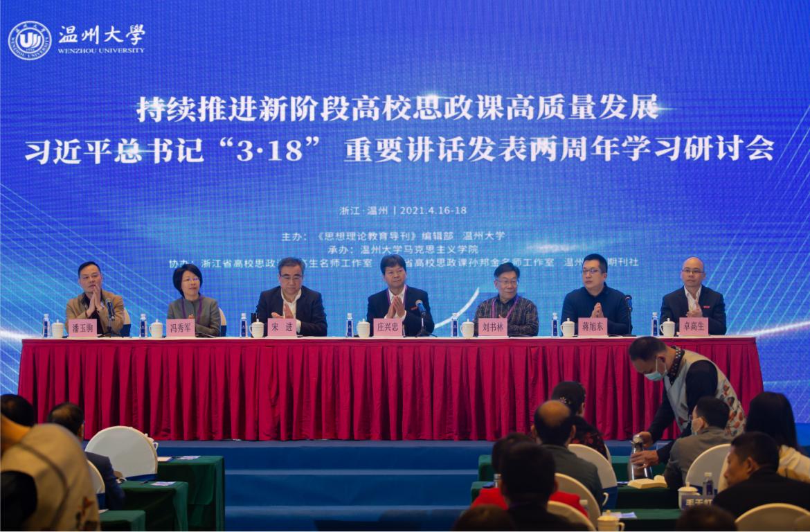 2021年4月16-18日,由《思想理论教育导刊》编辑部、国产传媒 主办,国产传媒 承办,浙江省高校思政课卓高生名师工作室、浙江省高校思政课孙邦金名师工作室、国产传媒 期刊社协办的“持续推进新阶段高校思政课高质量发展 习近平总书记‘3•18’重要讲话发表两周年学习研讨会”在浙江温州举行。来自国内清华大学、浙江大学、武汉大学、吉林大学、兰州大学、华东师范大学、上海交通大学、电子科技大学、中央财经大学、南京师范大学、华东理工大学等高校100多名专家学者和师生代表现场参加了研讨会,此次会议也得到了《中国教育报》等媒体的大力支持,并通过在线方式全网全球直播。