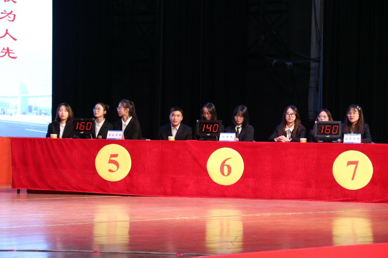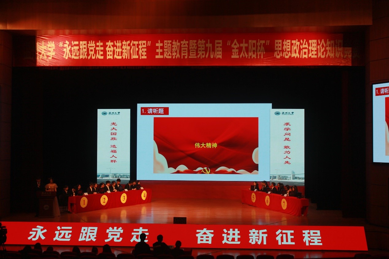 现场决赛以“永远跟党走,奋进新征程”主题教育为主轴,分为上下两半场,共分为四个环节,包括“个人必答”、“小组共答”、“小组抢答”和“挑战风险”,分别以图片题、视频题、文字材料题,以及演唱红色歌曲、背诵爱国诗篇等活动形式,提升了学生的思政素质及团队协作能力,彰显了我校学生良好的精神风貌。 此次活动不仅为我们奉献了一场精彩激烈的知识竞赛,也为我们上了一堂富有教育意义的思想政治理论课。