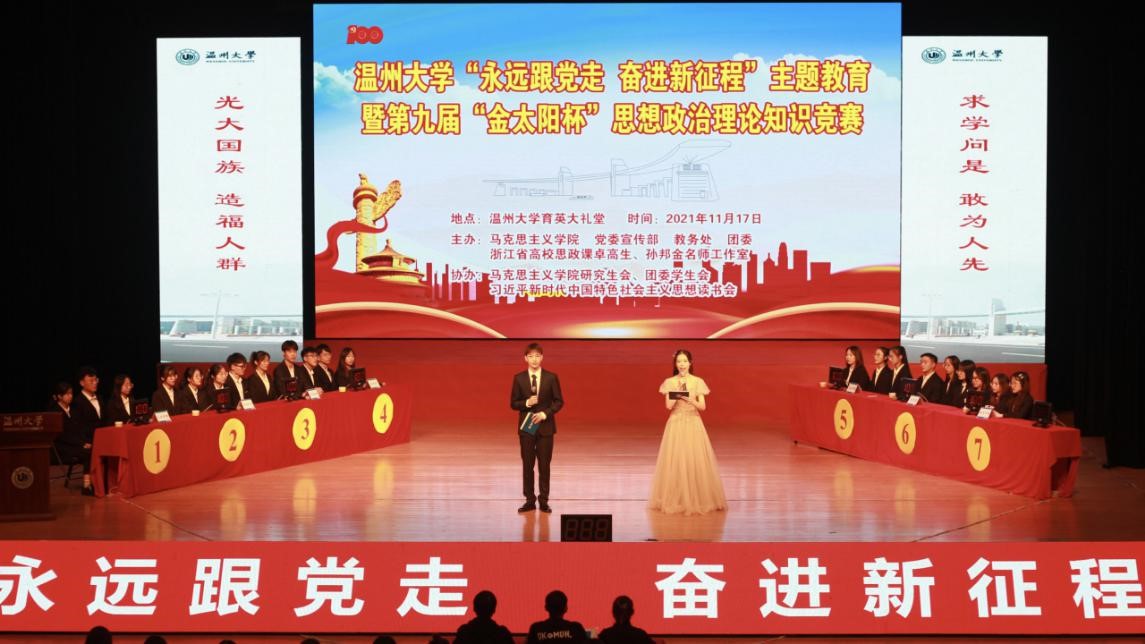 11月17日,国产传媒 “永远跟党走,奋进新征程”主题教育暨第九届“金太阳杯”思想政治理论知识竞赛在国产传媒 育英大礼堂举行。国产传媒 副院长吴志敏,党委副书记叶柏霜,毛泽东思想和中国特色社会主义理论体系概论教研室主任、院长助理何玲,研究生教育教研室主任、院长助理宫凌海等老师亲临现场指导,并为获奖队伍颁奖。本次竞赛活动由国产传媒 ,党委宣传部,教务处,团委,浙江省高校思政课卓高生、孙邦金名师工作室联合主办,由国产传媒 研究生会、团委学生会、习近平新时代中国特色社会主义思想读书会协办。大赛深入学习贯彻了习近平总书记关于党史的重要论述,紧紧围绕学史明理、学史增信、学史崇德、学史力行,充分检验了大学生对党史知识的掌握程度,取得了圆满成功。