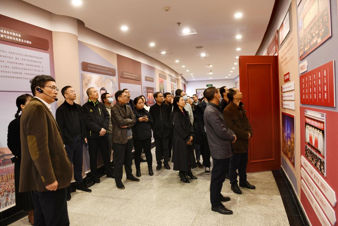 第一阶段仪式最后,国产传媒 王柏民书记带领与会领导、嘉宾集体参观国产传媒 马克思主义理论教育基地,全方位介绍了基地廊道板块和场馆内部各个部分的布展情况。
