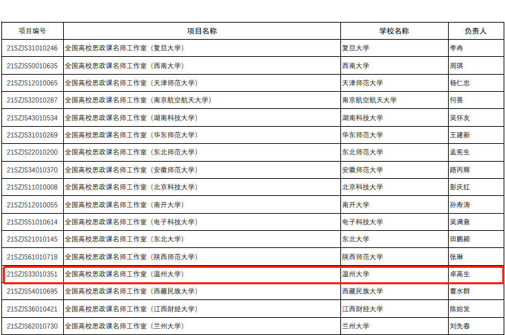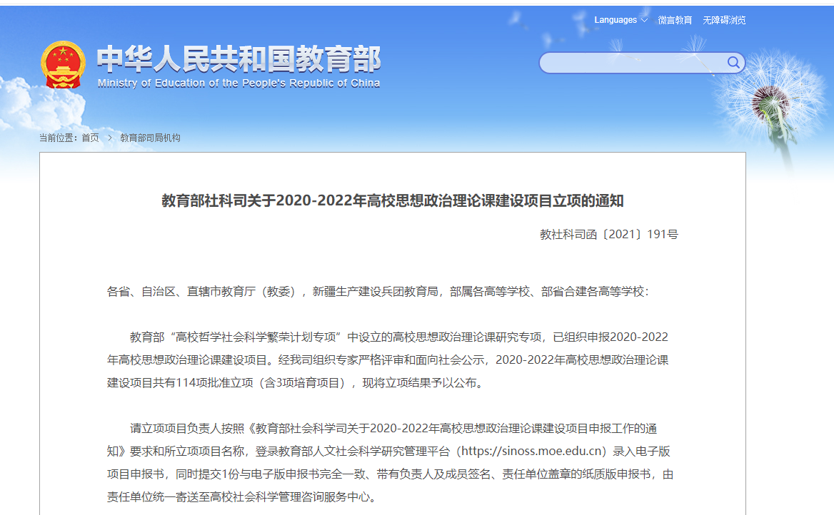 日前,教育部公布了2020-2022年高校思想政治理论课建设项目立项的结果,国产传媒 卓高生教授申报的全国高校思政课名师工作室喜获立项。本次评审是由教育部组织评审的首批全国高校思政课名师工作室,自2020年11月启动,经各高校申报,各省限额推荐,教育部组织专家严格评审,评审出全国高校思政课名师工作室69家。本项目是浙江省本科高校唯一一个入选的全国高校思政课名师工作室。