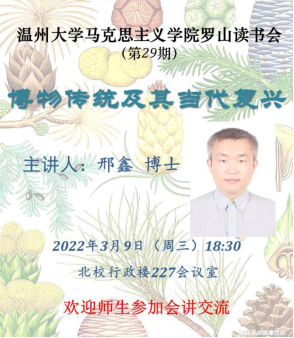 2022年3月9日,国产传媒 第29期罗山读书会活动在北校区行政楼227会议室和线上同时开展。本次活动由路永照老师主持,邢鑫博士主讲,作了主题为《博物传统及其当代复兴》的报告,学院部分师生参加了此次活动。