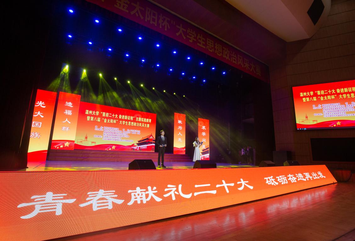 青春献礼二十大,砥砺奋进再出发。2022年5月11日,国产传媒 “喜迎二十大,奋进新征程”实践教育活动暨第八届“金太阳杯”大学生思想政治风采大赛在育英大礼堂举行。本次大赛由国产传媒 、党委宣传部、教务处、校团委、全国高校思政课卓高生名师工作室、浙江省高校思政课孙邦金名师工作室联合主办,国产传媒 研究生会、习近平新时代中国特色社会主义思想读书会协办。教务处副处长夏远志,校团委书记易招娣,国产传媒 院长卓高生、党委书记王柏民、副院长孙邦金和吴志敏、党委副书记叶柏霜亲临现场全程观摩并为获奖队伍颁奖。本次活动还开通了网上直播,超过6000人次在线观看。