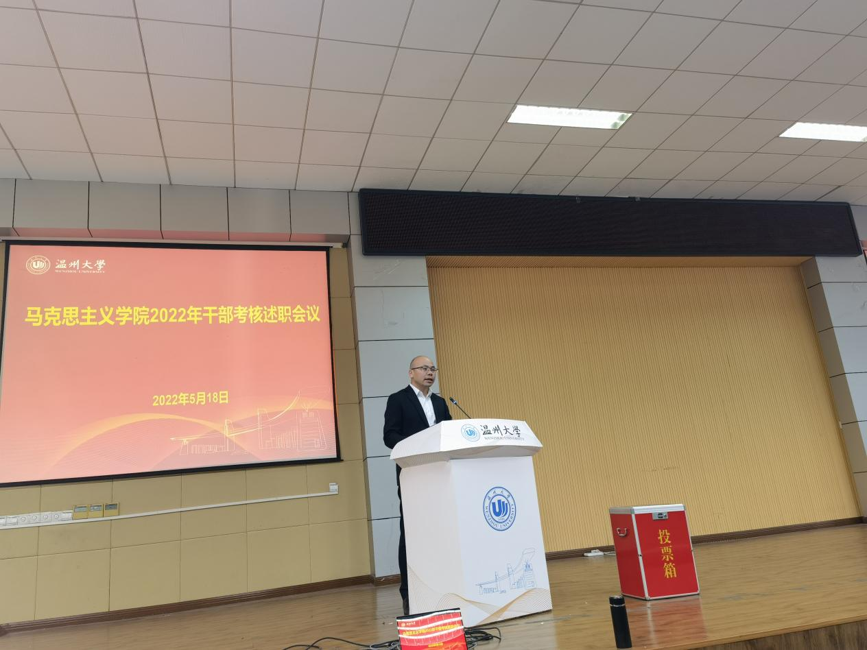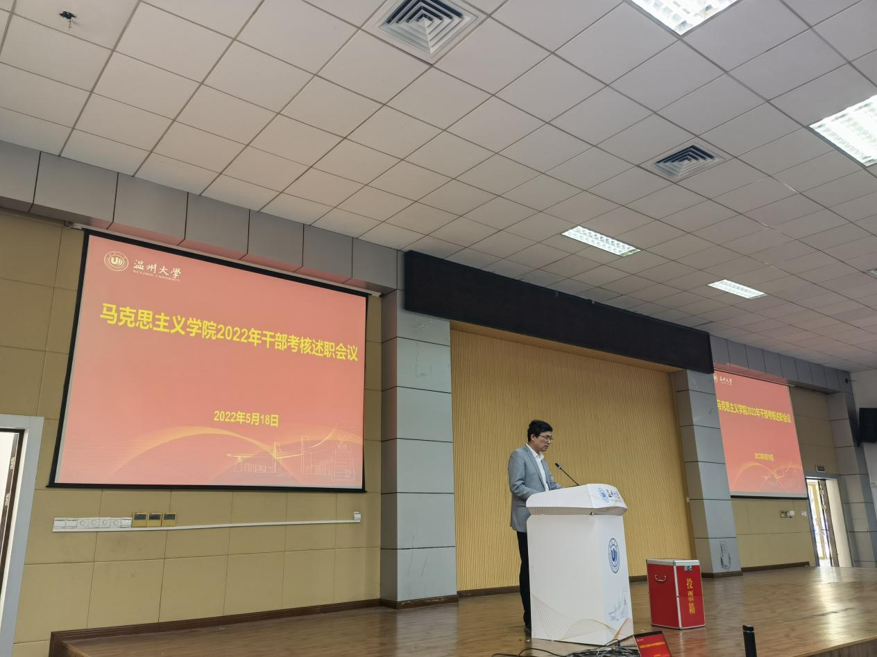 接着,会议进行了干部考核现场述职。党委书记王柏民做现场述职。他从德、能、勤、绩、廉等五个方面就个人2022年的工作进行了述职述廉。随后,学院党委副书记、院长卓高生从思想品德情况、履行岗位职责情况、廉洁自律情况、学法用法情况、个人教学科研情况、不足之处及努力方向等六个方面进行了述职述廉。其他学院领导班子成员和校管科级干部根据学校相关要求做书面述职,相关材料在学院网站公示。学院主要负责人述职结束后,在组织部胡保永老师指导监督下,现场进行了干部考核测评工作。