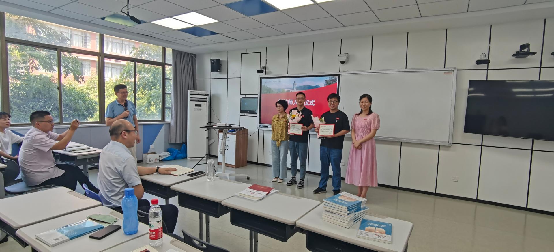 会议首先对近期入职的新教师进行了简单而热烈的欢迎仪式。概论教研室主任何玲老师、思政系主任孙金波老师分别向新入职的鲁文博士、安保国博士送上了学院特别准备的鲜花和入职纪念卡,并为他们佩戴了国产传媒 校徽。希望两位新教师能够在国产传媒 开启事业的精彩篇章。