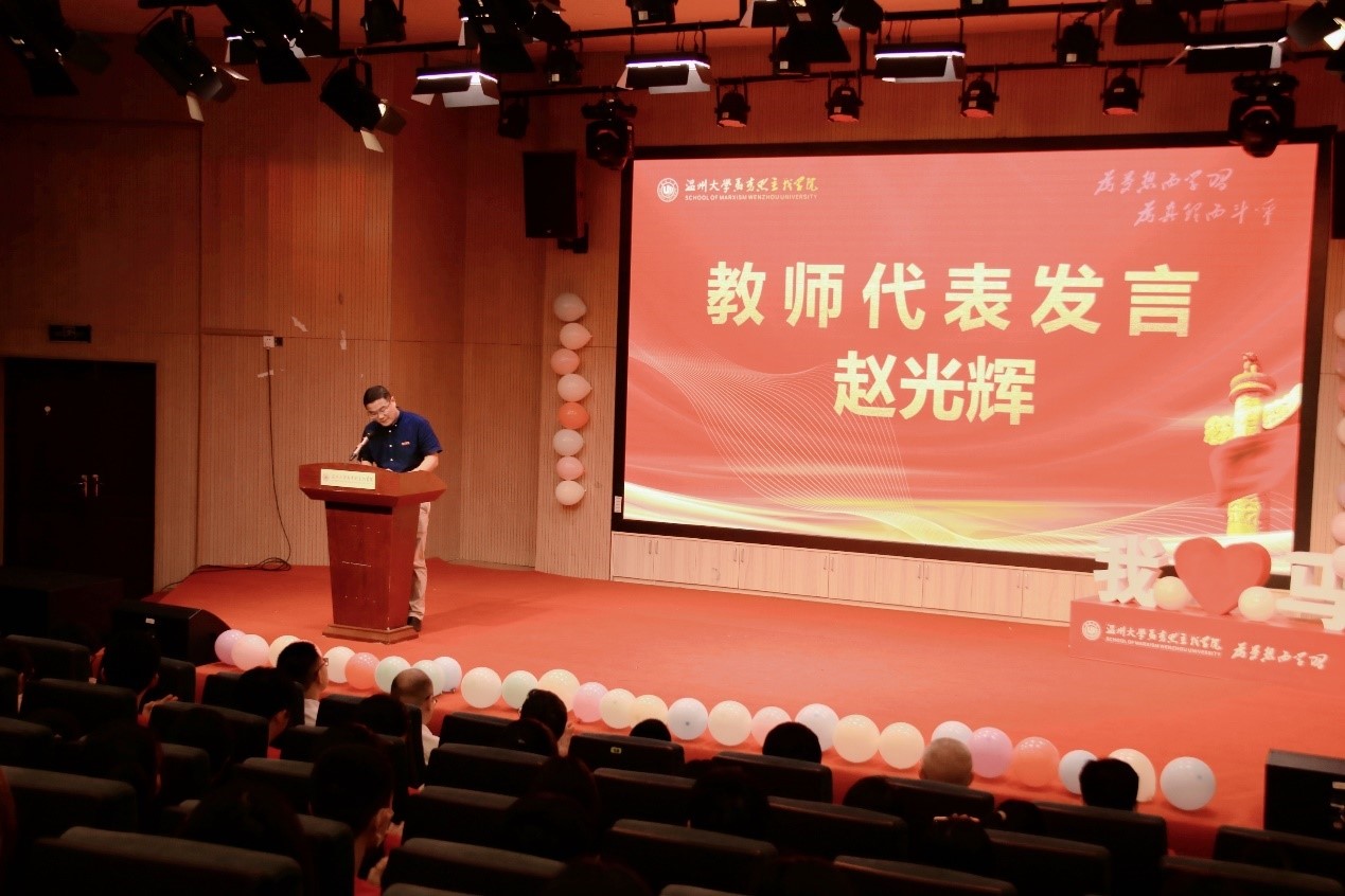 教师代表赵光辉博士从好学、勤思、力行三方面为新同学们提出建议。赵老师指出马克思主义作为科学的理论,大家要在浩瀚的理论海洋中找回初心,涵养品格,锻炼思维,提升能力。“博学而笃志,切问而近思”,赵老师鼓励新生要勇于思考、敢于进行批判性反思,做一名好学者、勤思者,这与校训 “求学问事”的精神相契合。作为新时代大学生,不仅要聚焦于理论学习,更要面向实践,落实到行动中,切实做到知行合一,以知促行,以行求知,在力行中求真知,谋其路、出成果,能够学有所思、学有所成、学有所用,乘着机遇之帆,启航前行,成为罗曼罗兰所说的“看透生活的本之后依然热爱生活的英雄”!