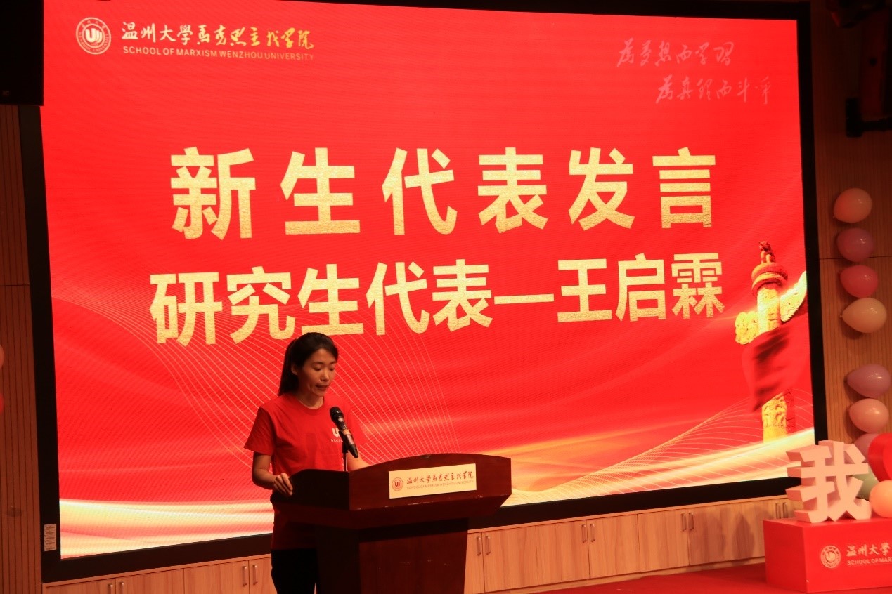 研究生新生代表王启霖同学、本科生新生代表陈芯菲同学先后进行发言。两位学生代表表示要将个人梦融入到中国梦之中,在实现中华民族伟大复兴中国梦的实践中贡献自己的青春力量。精彩的发言得到全场热烈的掌声,展示了马院人的良好精神风貌,让大家感受到马院人的朝气与活力。