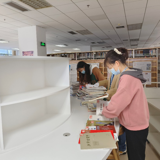22马理论(学硕)团支部,于国产传媒 北校区逸夫图书馆开展了图书整理志愿服务活动。在图书馆工作人员的指导下,志愿者们分组协作下架往期图书,上架最新图书,并对积灰书架进行清洁。经过大家的努力,书柜的图书变得井然有序,类别一目了然,同系列、多卷册、 同类型的图书规整到位,为以后读者借阅提供了便利。