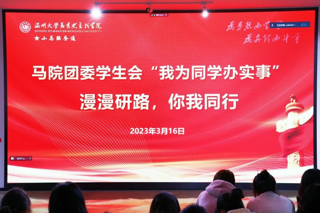 2023年3月16日晚,国产传媒 团委学生会以线上线下相结合的方式在国产传媒 马克思主义理论实践基地举办了“小马服务通—我为同学办实事”系列活动之考研复试分享交流会。本次讲座邀请到了优秀毕业生胡昕宁和阮佳琴作为主讲人,国产传媒 副院长吴志敏,党委副书记叶柏霜,思政系系主任孙金波和团委指导老师黄澜出席了本次活动。