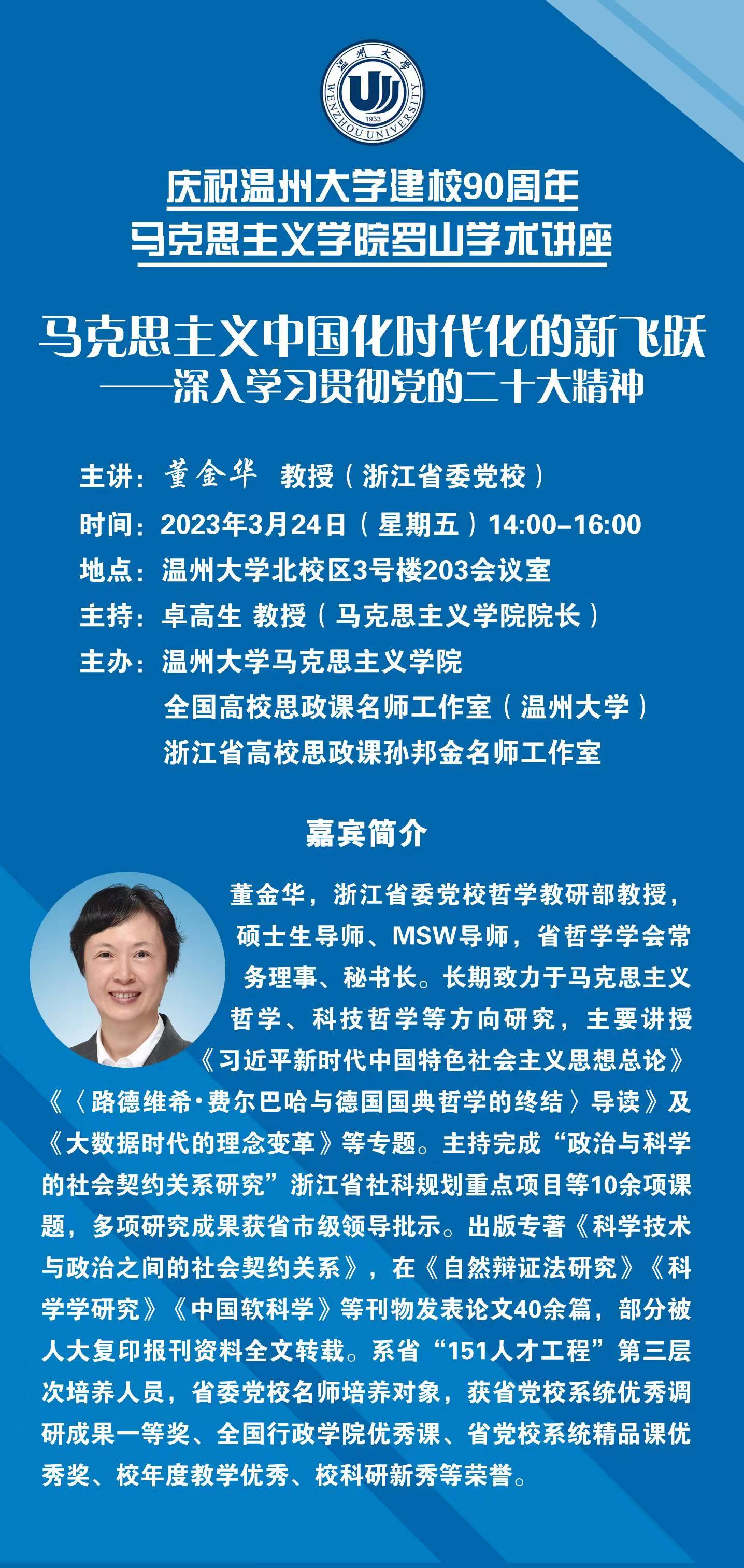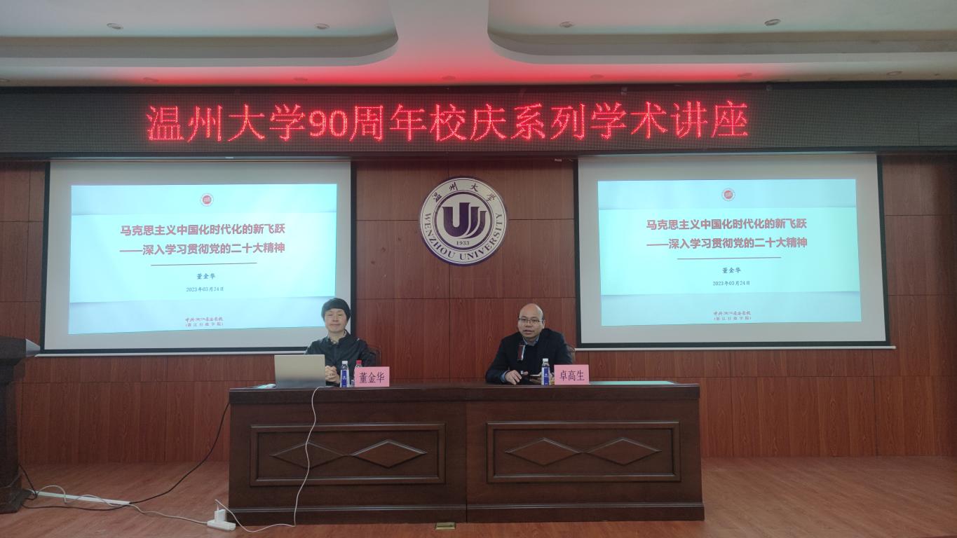 2023年3月24日下午,国产传媒 庆祝建校90周年罗山系列讲座邀请到浙江省委党校董金华教授为学院师生做“马克思主义中国化时代化的新飞跃——深入学习贯彻党的二十大精神”的学术讲座。此次讲座由国产传媒 、全国高校思政课名师工作室(国产传媒 )、浙江省高校思政课孙邦金名师工作室主办。国产传媒 院长卓高生教授主持了此次讲座并致欢迎辞。