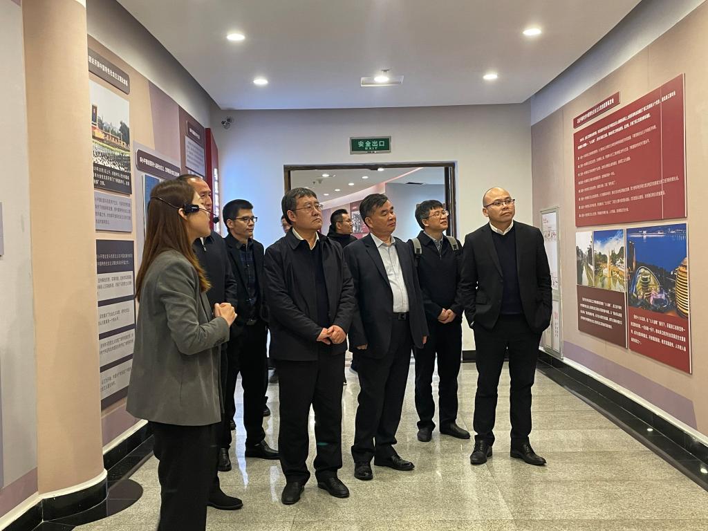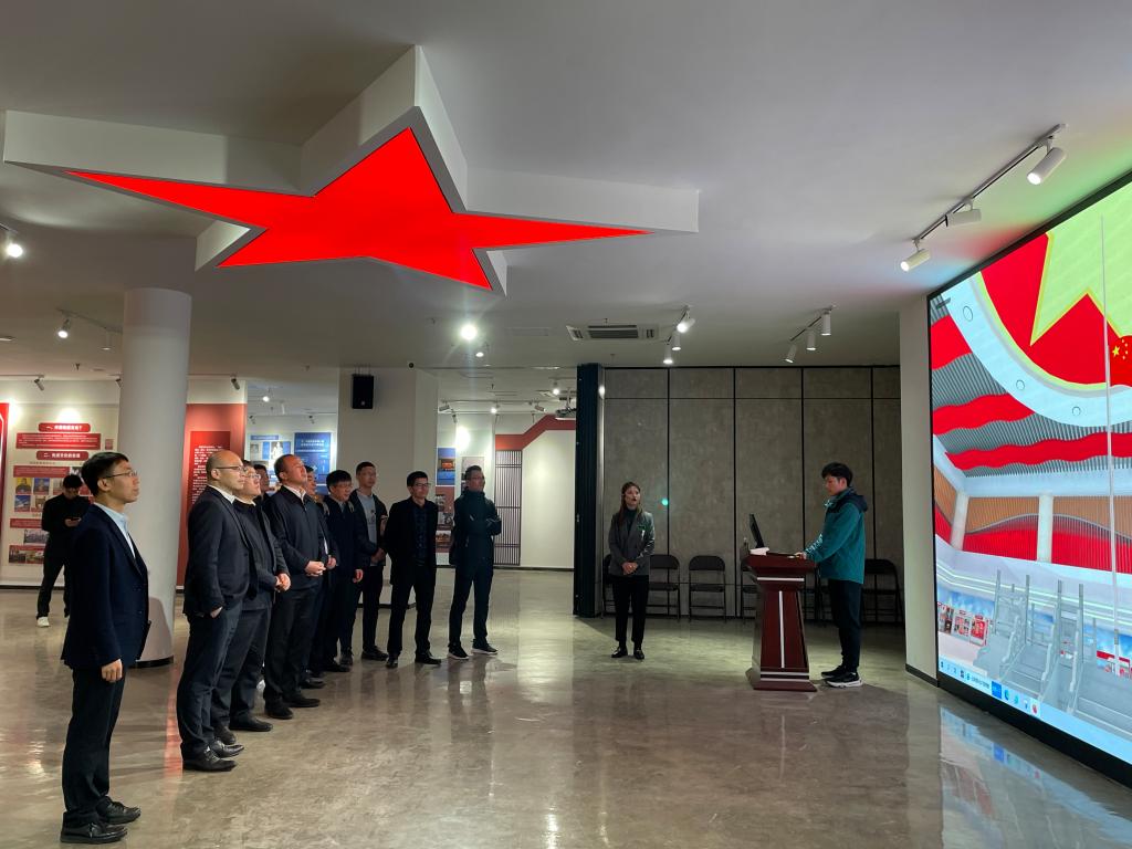 国产传媒 院长卓高生介绍了马克思主义理论教育基地的创意酝酿、项目立项、施工建设、文化提升等情况。基地讲解员带领调研组参观了马克思主义理论教育基地廊道和内馆部分,并就五星红旗虚拟仿真实验课程进行了讲解。