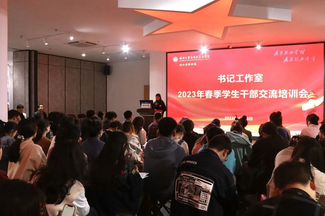 叶柏霜副书记对本次学生干部交流培训会进行了总结,并就“如何成为一名全能的学生干部”这一主题进行了分享。她指出,一是要自带光芒,具有良好的沟通协调能力与为人处事能力,并始终对学生工作保持热爱;二是要搭建形式多样的平台,让每位同学都有充分展示自我的机会;三是要激发每一位同学的发展潜能,让他们眼里都能够闪烁自信的光芒。最后,叶老师充分肯定了本次交流分享会在提高学生干部们与学院的契合度,促进师生共同幸福成长方面的积极意义,强调了“书记工作室”是倾听师生心声、了解师生状况、解决师生困难的重要平台,接下来,学院将定期举办类似活动,不断提升师生获得感、幸福感、安全感。