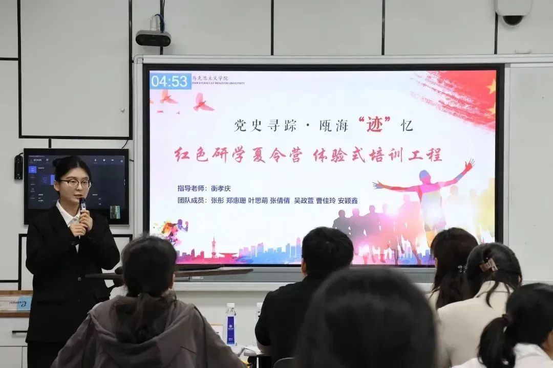 随后,十支队伍对本组PPT和参评项目进行了详细介绍,对项目的背景、项目的优势、项目的目的、项目的受益等各个方面进行全面阐述,条理清晰地回答了现场评委提出的问题。通过评委们的打分,“英雄浙江、烽火浙南——探寻乡村旧址里的红色记忆"获得金奖;“马列繁星宣讲赋能团”与“烤焙温暖”获得银奖;“心火相传——积极心理学视域下乡村儿童成长提升公益项目”、“墟里·农”和“党史寻踪瓯海“迹”忆、红色研学夏令营体验式培训工程”获得铜奖。