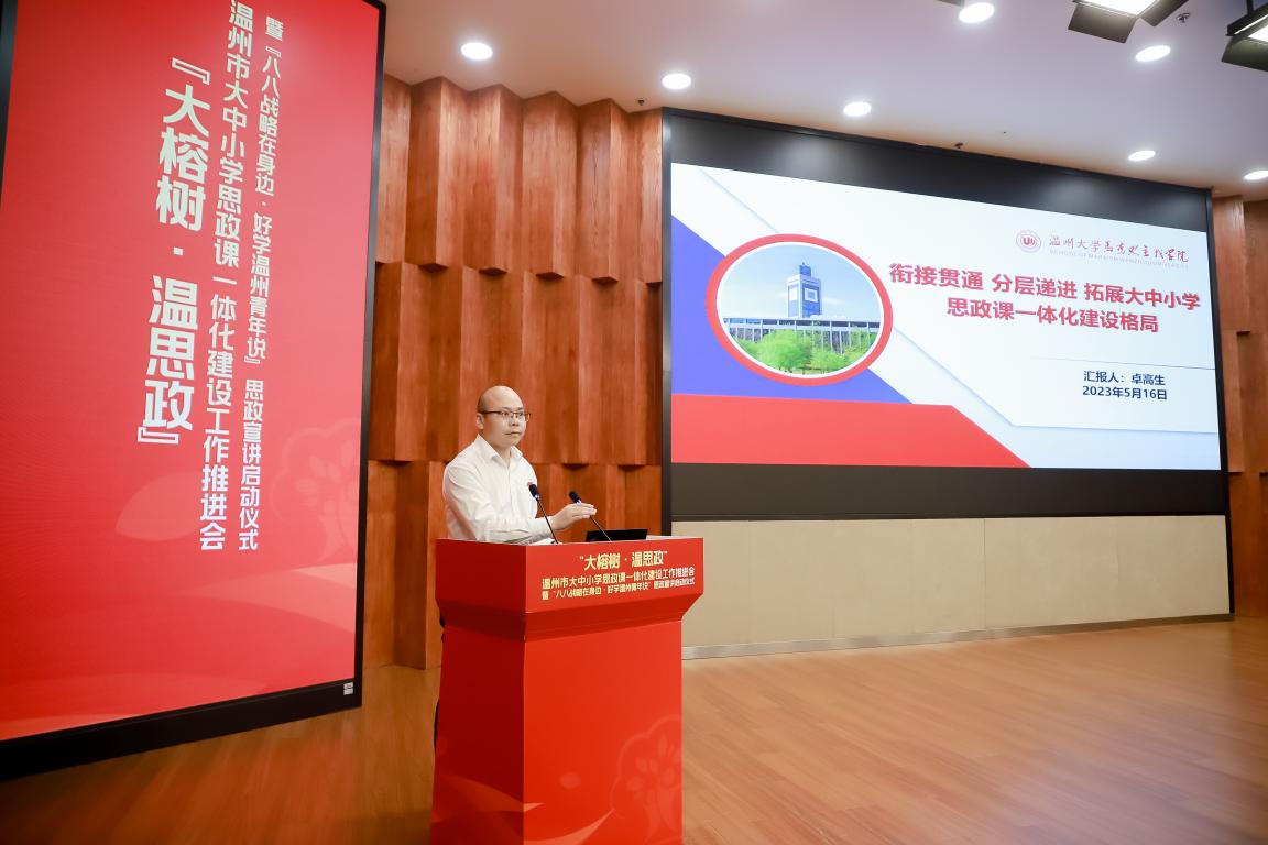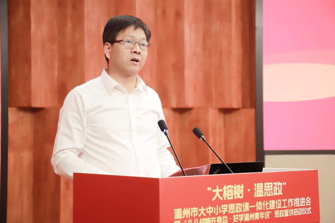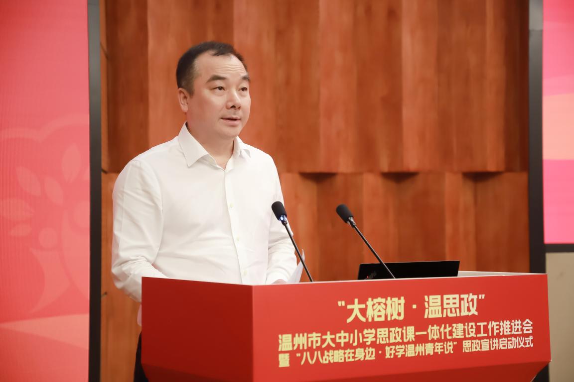 他强调,围绕大中小思政课一体化建设工作,各县市区教育局、各高校各中小学,要从四个方面落实、落细。第一,坚持“大局观”,在思想认识上再拔高。要从复兴大局、时代新局、教育全局等角度来看待思想政治理论课在立德树人中发挥的应有作用。第二、聚焦“大思政”,在体系建设上再创新。坚持循序渐进、螺旋上升,坚持纵向贯通、横向融通,坚持品牌融合、联盟共进。第三、争做“大先生”,在队伍建设上再升级。壮大思政教师队伍,追求德才双优、创新学研宣教形式。第四、强化“大协同”,在思政联动上再强化。他希望温州市以大中小学思政课一体化建设为契机,扛起责任担当,强思政、优宣教,努力让温州思政教育像大榕树一样,枝干粗壮、枝繁叶茂,成为“好学温州”的一面金字招牌