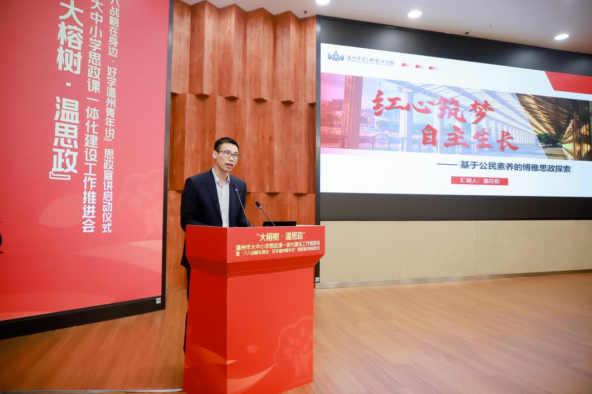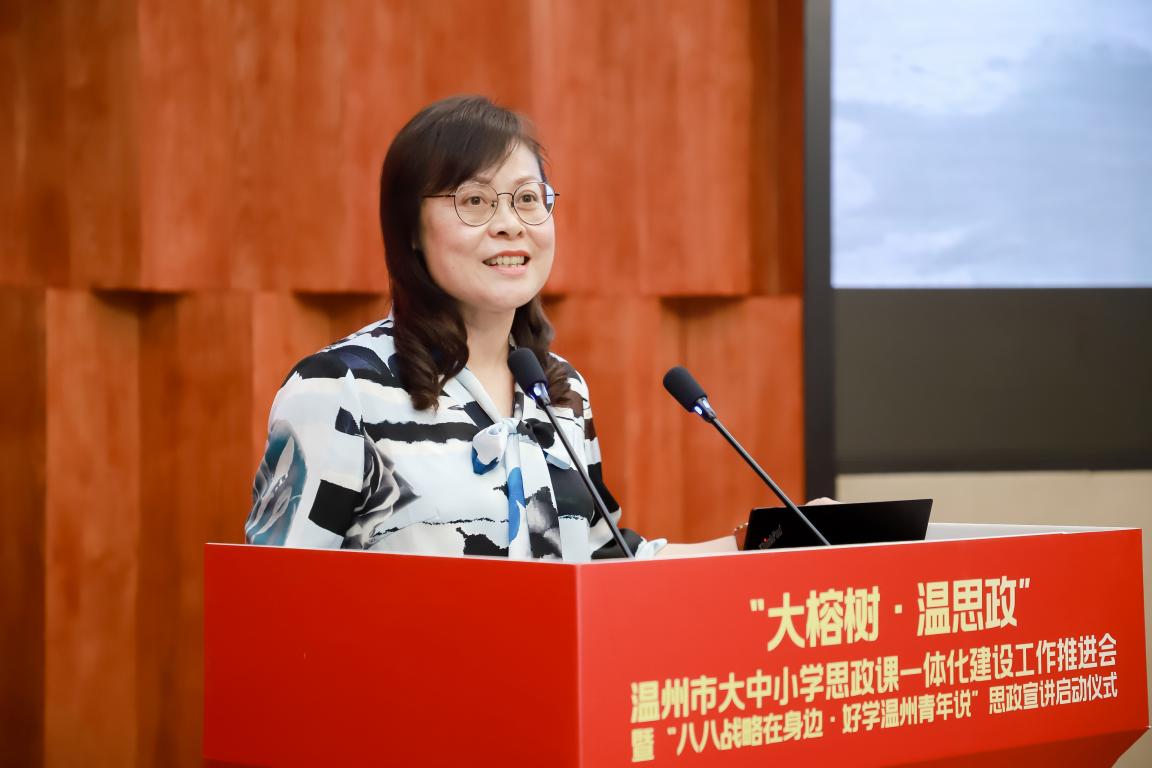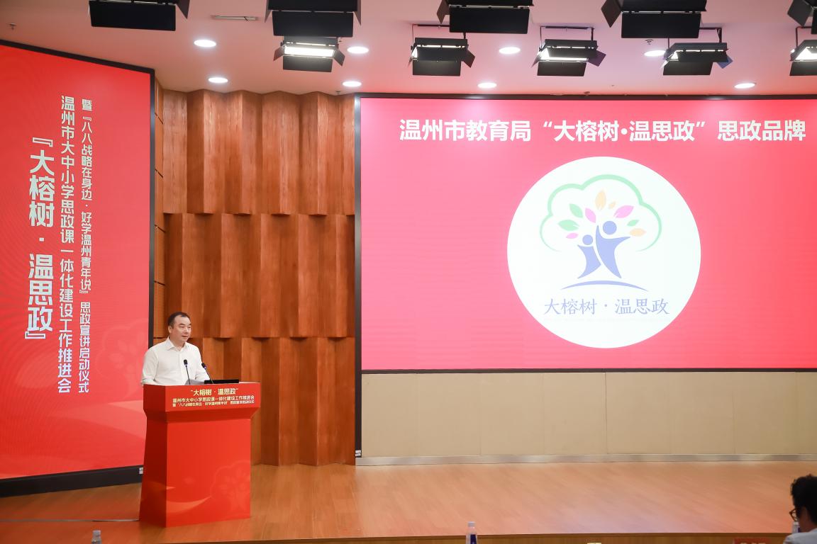 中共温州市委教育工委专职副书记、温州市教育局党委副书记王剑波为全体与会人员解读“大榕树·温思政”品牌的内涵。“大榕树·温思政”品牌,是牢记习近平总书记殷殷嘱托,坚持立德树人,突出融合一体的生动写照,希望大中小学思政课能够像大榕树一样,有壮实的主干、丰富的载体,建立“融合树人”模式;能够按照“循序渐进、螺旋上升、衔接有序、内涵发展”的目标要求,建成具有温州特色的大机制、大师资、大课程、大教研、大基地“五位一体”的大思政课体系,并通过发起成立温州市大中小学思政课一体化建设联盟,推动建立市域层面大中小学思政课一体化建设共同体,努力让思政教育像大榕树一样,成为温州的一面“金字招牌”。