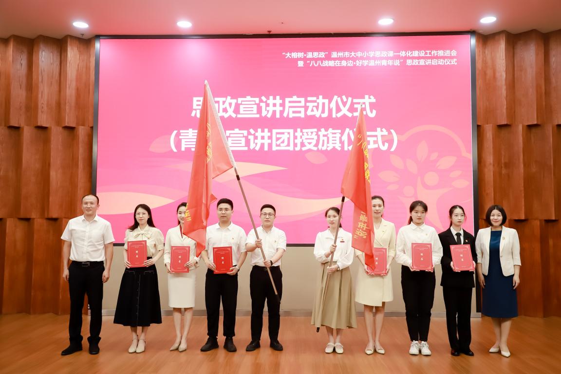 中共温州市委宣传部副部长曾伟、省教育厅宣传教育与统战处葛红敏老师为青年宣讲团授旗并颁发聘书。宣讲团成员国产传媒 周佳莼、温州第二高级中学王聪、平阳鳌江小学项伟带来了精彩的大中小学思政课教师微联讲。