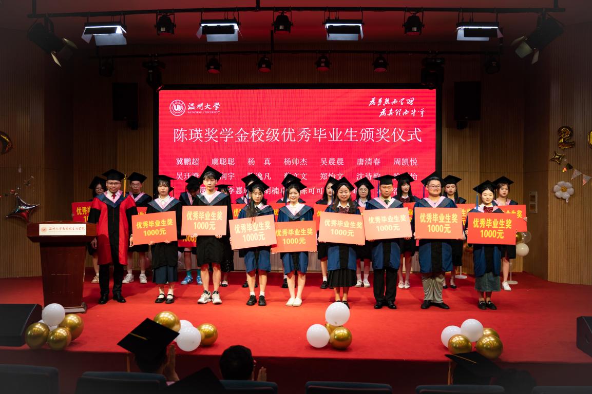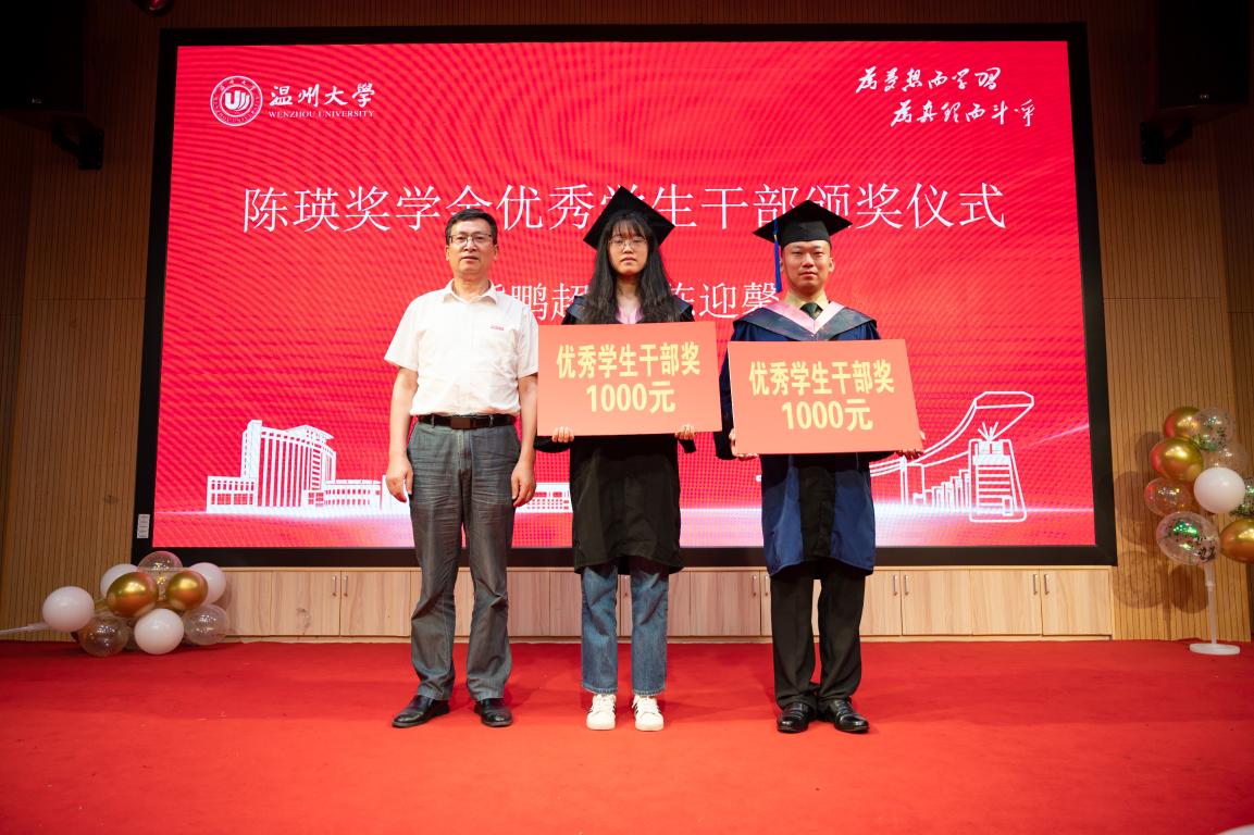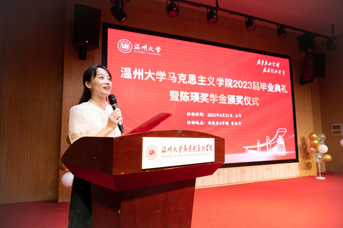 毕业典礼还进行了陈瑛奖学金颁奖仪式。陈瑛校友是国产传媒 (原温师院)89届思政专业毕业生,他热心社会公益事业,多次捐赠、募集资金帮助家乡及四川、贵州、云南等地的学校建设和贫困师生。陈瑛校友对母校怀有深厚的感情,他慷慨解囊,为马院学子设立陈瑛奖学金,支持和鼓励同学们不断努力追求卓越,积极奉献社会。此次陈瑛奖学金设立考研(考博)升学奖、学科竞赛奖、优秀毕业生奖、优秀学生干部奖和青春励志奖,由党委书记王柏民老师、院长卓高生老师、副院长孙邦金老师、副院长吴志敏老师为获奖学生颁奖。