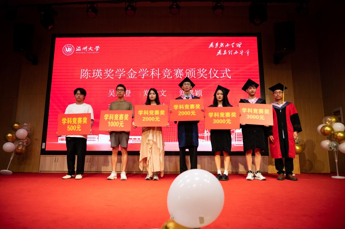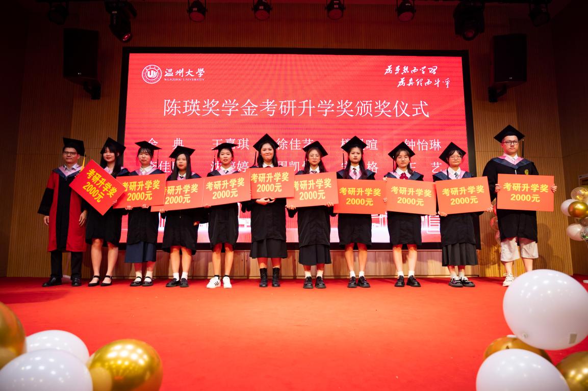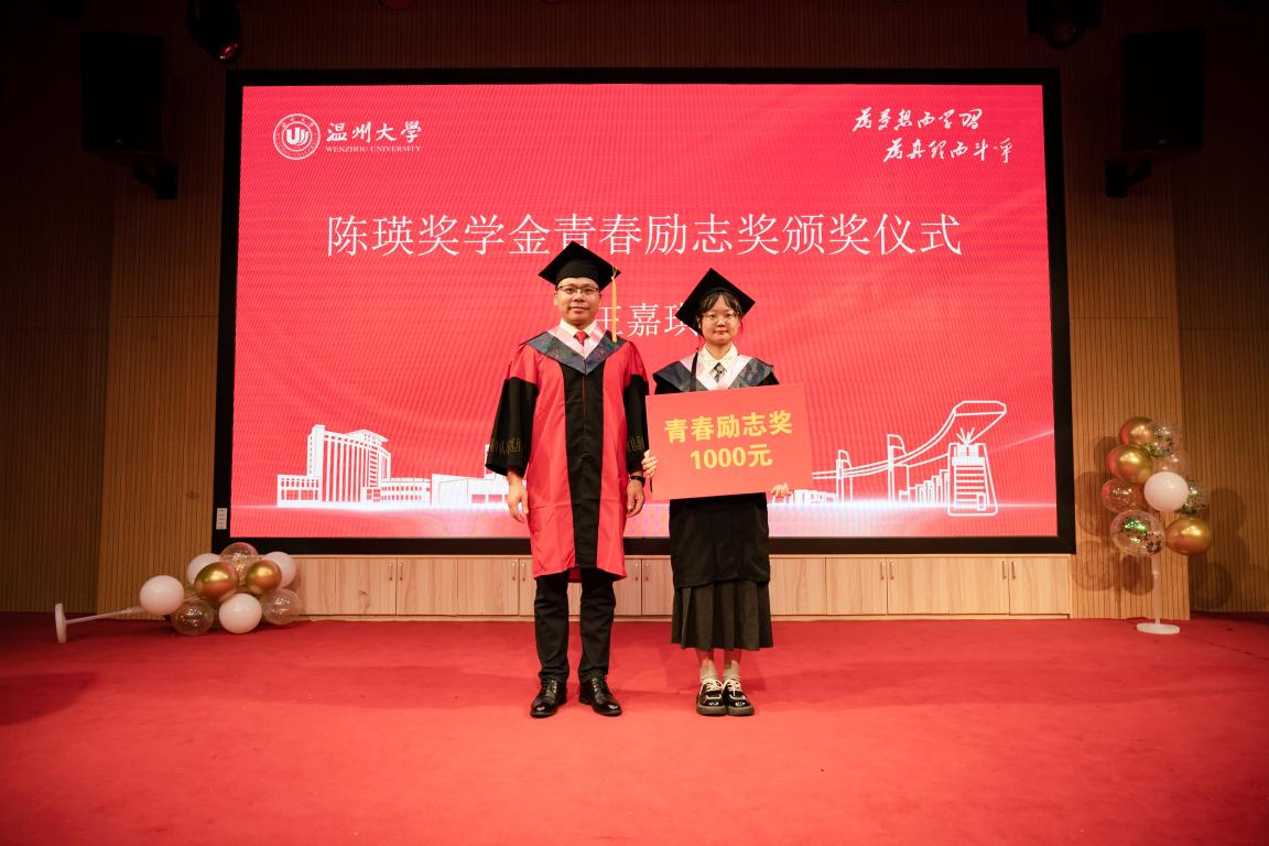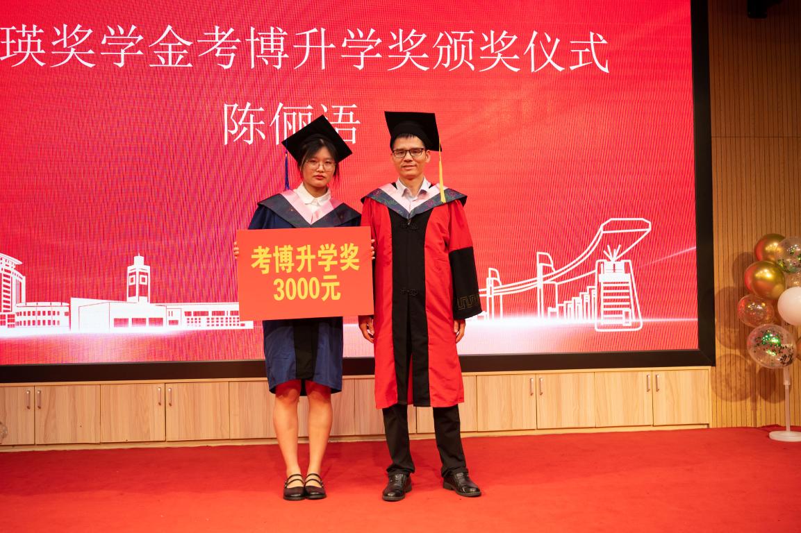 毕业典礼还进行了陈瑛奖学金颁奖仪式。陈瑛校友是国产传媒 (原温师院)89届思政专业毕业生,他热心社会公益事业,多次捐赠、募集资金帮助家乡及四川、贵州、云南等地的学校建设和贫困师生。陈瑛校友对母校怀有深厚的感情,他慷慨解囊,为马院学子设立陈瑛奖学金,支持和鼓励同学们不断努力追求卓越,积极奉献社会。此次陈瑛奖学金设立考研(考博)升学奖、学科竞赛奖、优秀毕业生奖、优秀学生干部奖和青春励志奖,由党委书记王柏民老师、院长卓高生老师、副院长孙邦金老师、副院长吴志敏老师为获奖学生颁奖。