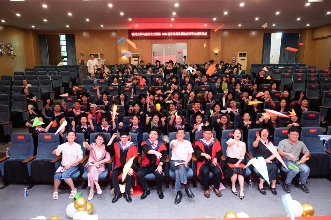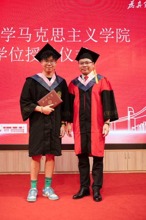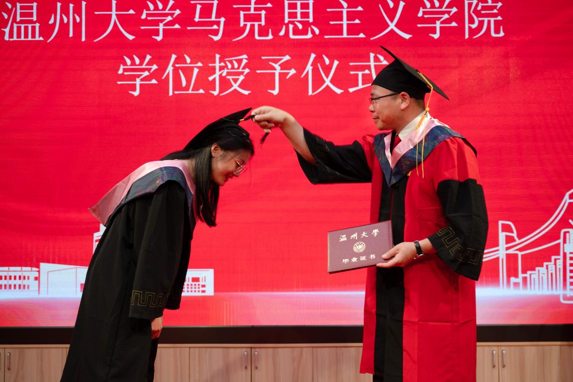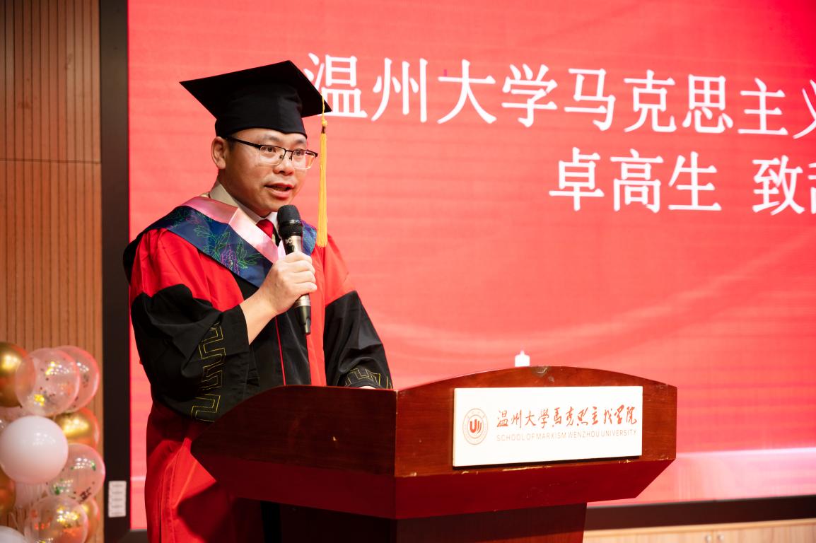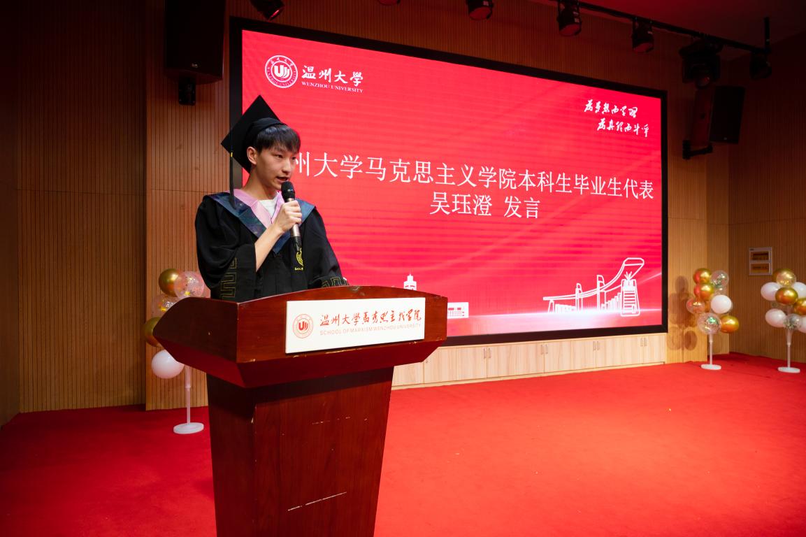 2023届研究生毕业生代表陈俪语、本科生毕业代表吴珏澄讲述了自己在马院的成长经历,表达了对学校、学院和老师们的感激之情,未来他们无论身处何方,都将带着马院永远的精神印记,坚持初心、坚守使命,将社会责任与个人志趣相结合,找到属于自己的人生意义。无愧于马院的培养,无愧于温大的期盼。