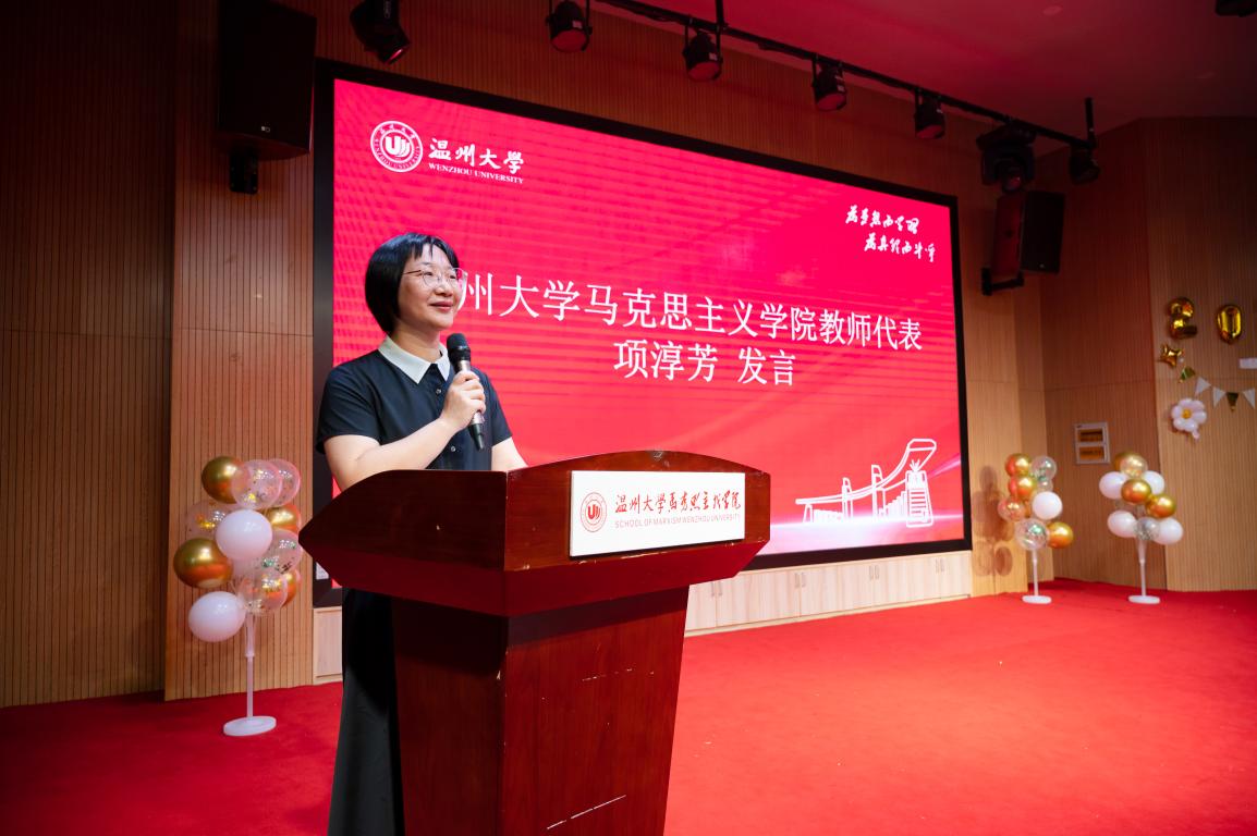 “我们拥有共同的名字——温大思政人!而在背后托举你、我共同成长的是不断续写奋斗荣光的90岁母校和45岁母院。”33年前的今天,项谆芳老师从温州师范学院政教系政史专业毕业。作为教师代表的她分享了自己当年的大学生活,并送上叮嘱与期待:一是正确认知和定位自己,明确站在哪、走向哪、怎么去?认真总结和正确认识自己在大学的学习生活经历,才能更好地迈向人生新征程;二是铭记“马字当头”,坚持“为梦想而读书,为真理而斗争”的马院院训,按照习近平总书记对思政人的“六要”标准去锤炼自己,到社会上、到实践中继续学习马克思主义,不断深化对马克思主义的理解和认识,提升马克思主义的理论和实践素养。
