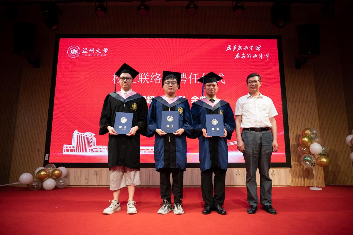 校友联络员是母校和校友、校友和校友之间沟通交流的重要桥梁和纽带。在校友联络员聘任仪式上,党委书记王柏民老师为冀鹏超、朱成刚、余典发放聘书,希望毕业学子们心系学校、学院,为促进学校与学院的事业发展贡献力量。