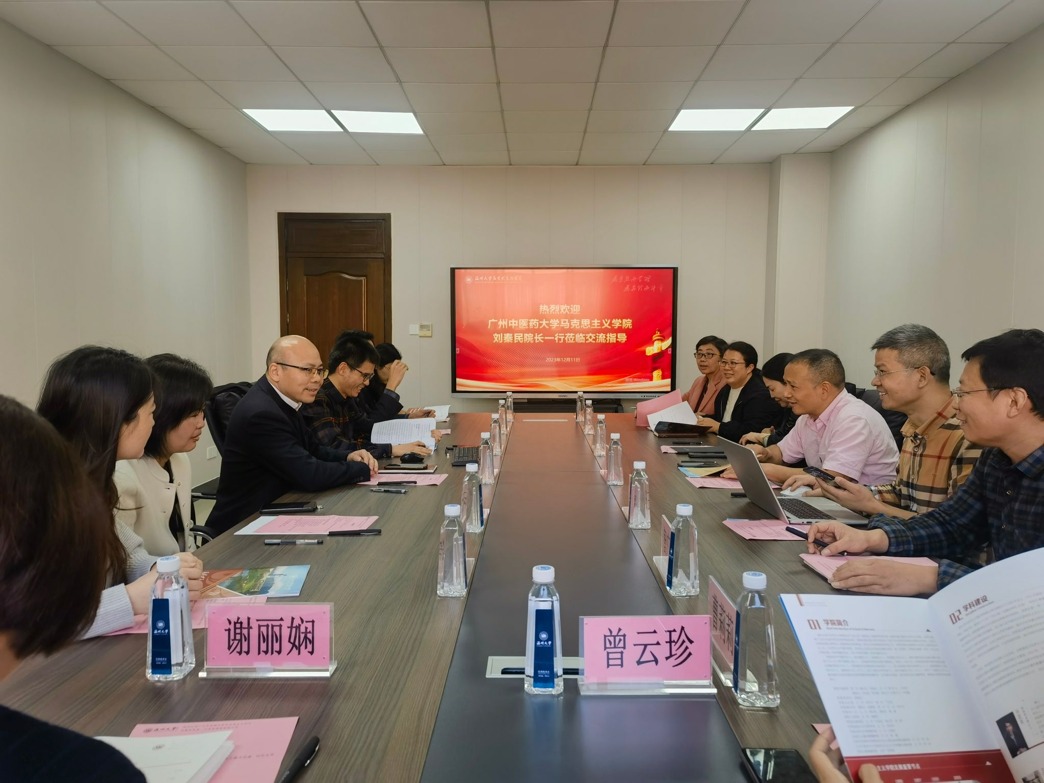 12月11日,广州中医药大学国产传媒 院长刘秦民教授一行11位专家学者来访国产传媒 ,就思政课程建设经验、思政课程与课程思政协同育人模式构建以及研究生思政课建设经验进行座谈交流。交流会由副院长吴志敏主持,卓高生院长出席会议。纲要教研室主任刘春元、原理教研室主任骆徽参加会议。