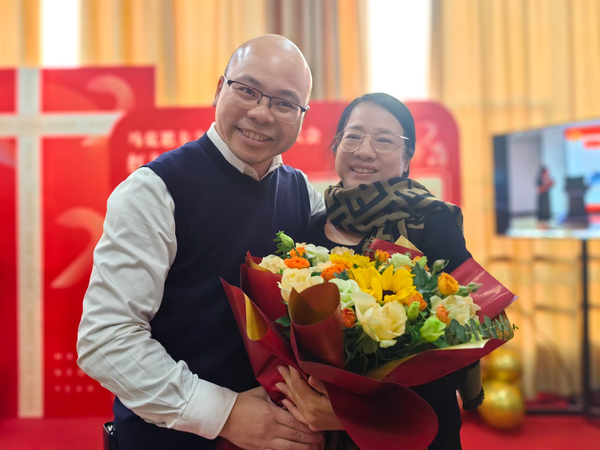 本次联欢会还特别举行了谢建芬老师荣休仪式。谢建芬老师作为学院工会主席,多年来为学院的发展做出了重要的贡献。王柏民书记代表学院高度肯定了谢老师的工作,赞扬她辛勤耕耘、无私奉献的精神。为了表达对谢老师的敬意和感激之情,院长向她敬献了鲜花,代理工会主席郑旭敏则向谢老师送上了荣休纪念品。随后,全体教师一起分享了学院精心定制的蛋糕,纷纷表达了对谢建芬老师的荣休祝福。