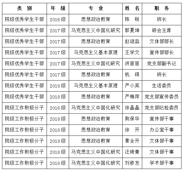 根据《国产传媒 优秀研究生奖励办法》(行政〔2006〕87号)和《关于开展国产传媒 2018/2019学年研究生优秀学生干部、工作积极分子的评选通知》的文件精神,结合国产传媒 研究生工作实际,决定开展国产传媒 2018/2019学年研究生优秀学生干部和工作积极分子的评选。根据国产传媒 学生干部的日常表现,结合学院指导老师的意见,经全体研究生投票确定郭夏坤等8位同学为院级优秀学生干部推荐人选,荆保华等6位同学为院级工作积极分子推荐人选。如有异议,请在2019年4月25日前与国产传媒 办公室曾老师联系,电话:86680973。