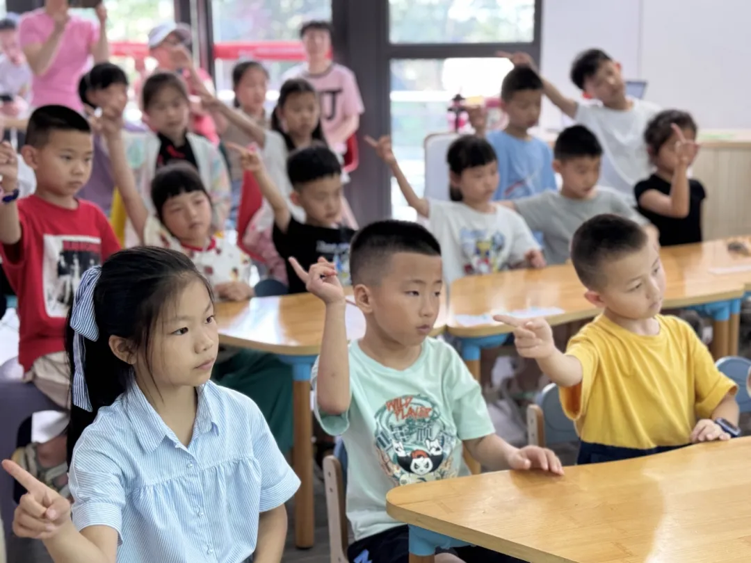 接着,未成年人跟着志愿者一边学习《红星闪闪》儿歌手势舞,一边唱着“红星闪闪放光彩,红星灿灿暖胸怀,跟着毛主席跟着党,闪闪的红星传万代。”最朴实的歌词,唱出了他们对党的敬爱。