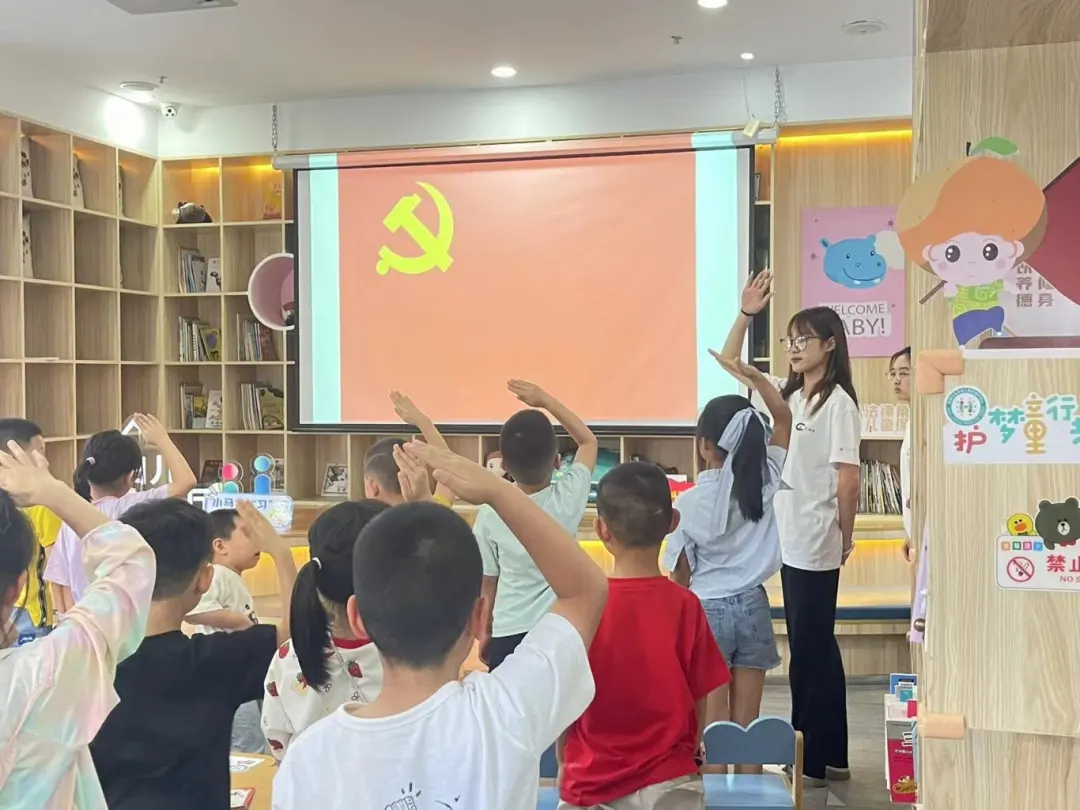 活动现场,国产传媒 小马实践队的志愿者带领未成年人一起了解建党节的由来。1921年7月23日,中国共产党第一次全国代表大会在上海秘密召开,后因安全问题而转移到嘉兴南湖的一艘游船上继续开会并圆满闭幕,此举标志着中国共产党的诞生。志愿者通过我问你答方式,来增加大家对党史的了解,最后邀请未成年人一起向党旗敬礼。