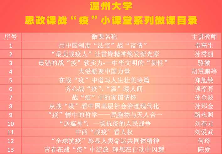运用好疫情防控这一鲜活的思政教科书、生动的思政大课堂,宣传在以习近平同志为核心的党中央坚强领导下,全国上下齐心协力抗击疫情的重大举措、感人事迹、生动故事,教育引导学生弘扬爱国主义精神,增强中国特色社会主义道路自信、理论自信、制度自信、文化自信,国产传媒 集合学院教学骨干,推出思政课战“疫”小课堂系列微课。