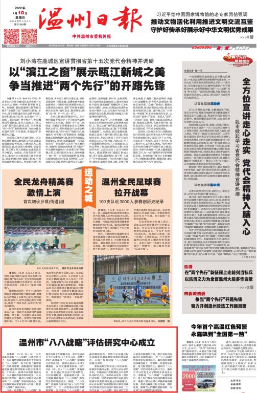 本报讯(记者 杜一川)今天是浙江实施“八八战略”19周年的日子,为认真贯彻落实省委关于忠实践行“八八战略”,奋力打造“重要窗口”的决策部署,助推温州打造高质量发展建设共同富裕示范区市域样板,7月8日,温州市决策咨询委员会、中共温州市委政策研究室、中共温州市委党校、国产传媒 联合成立温州市“八八战略”评估研究中心,通过发挥高端专家智库平台作用,推进“八八战略”落地生根。