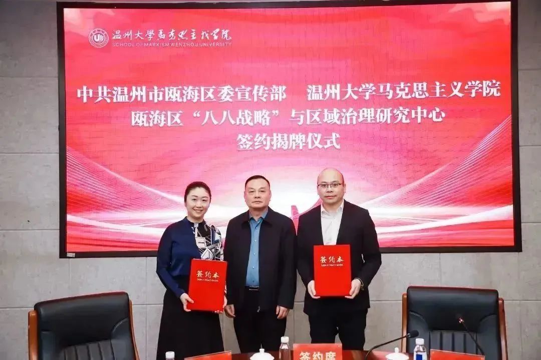 双方举行了合作共建签约仪式和中心揭牌仪式,并为瓯海区“八八战略”与区域治理研究中心博士宣讲团颁发聘书。